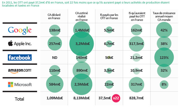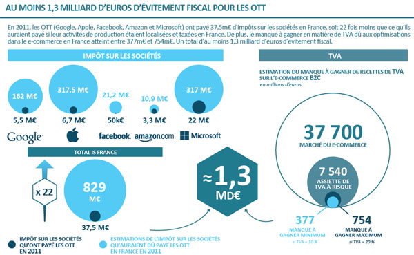 En 2011, les OTT auraient payé plus de 800 m€ d’IS et, entre 400 et 700m€ de TVA en France, si leurs activités de production avaient été soumises aux règles de marché locales, sans aucune optimisation, contre quelques dizaines de millions d’€ réellement payés en impôts et taxes