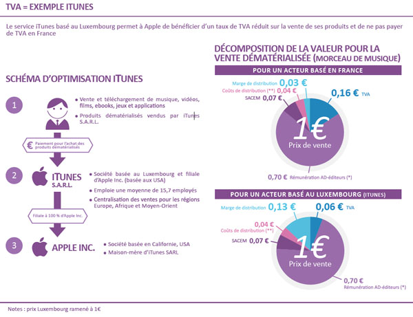 Sur les produits immatériels comme la musique en ligne ou les livres numériques, Apple et Amazon reversent l’intégralité de leur TVA au Luxembourg, autre paradis fiscal européen