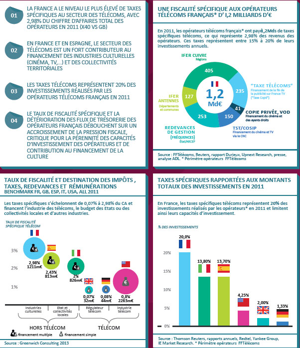 – La France a le niveau le plus élevé de taxes spécifiques au secteur des télécoms, avec 2,98% du chiffre d’affaires total des opérateurs en 2011 (x40 vs GB)