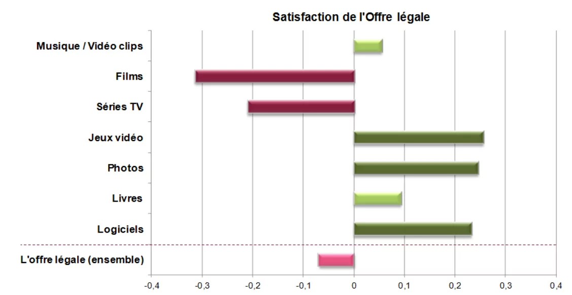 Pour autant le degré de consommation et de satisfaction varie d’un produit à l’autre. Si les jeux vidéos, photos et logiciels bénéficient d’un certain succès, les series et les films (biens les plus consommés), l’insatisfaction est massive. Côté musique, l’offre est jugée correcte