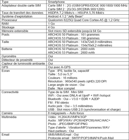 Caractéristiques des ARCHOS 50 Platinum et 53 Platinum