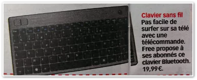 Nos confrères de Freebox-V6 ont découvert une photo plutôt intrigante dans le magazine Télé-Loisirs (édition N°1417). Cette dernière montre un clavier Bluetooth proposé aux abonnés Free à 19,99 euros. Inutile de vous précipiter, le clavier sans fil n’existe pas dans la boutique en ligne de Free. « Pas facile de surfer sur sa télé avec une télécommande. Free propose à ses abonnés ce clavier Bluetooth à 19.99 euros » explique le magazine.