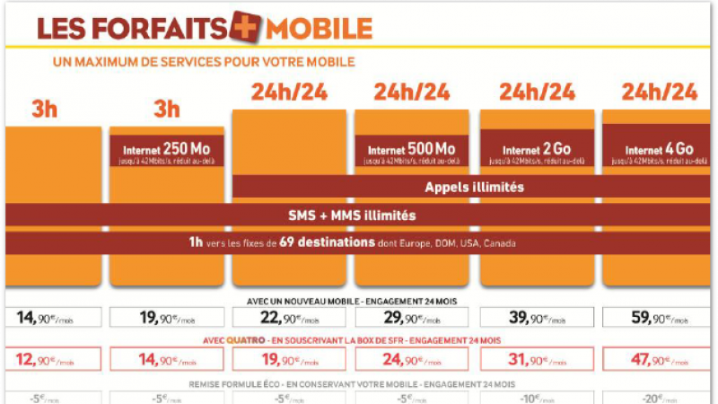 Les forfaits mobiles varient entre 12,90€/mois pour 3h d’appels + SMS/MMS illimités + 1 h d’appels vers 69 destinations internationales à 47,90€/mois pour les appels en illimité + les SMS/MMS en illimité, 4Go de DATA en H+ (jusqu’à 42Mb/s) et toujours 1h d’appels vers 69 destinations internationales. Ces tarifs sont proposés avec un engagement de 24 mois. De son côté, la box de SFR est proposée à partir de 29,99€/mois.