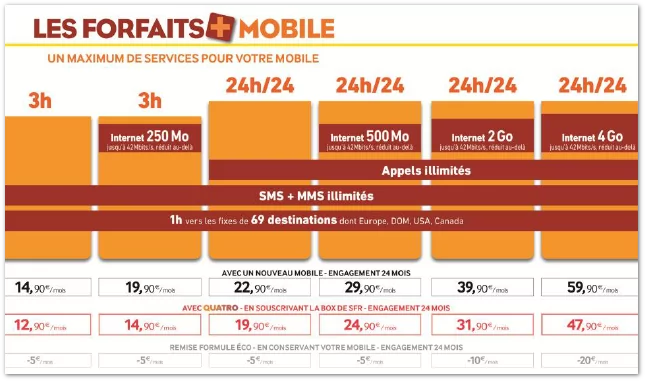 • Le tarif du Forfait + Mobile 3h 250Mo La Poste Mobile sera ramené à 14,90€/mois pour un client souscrivant à la box de SFR, (à partir de 29,99€/mois) soit une l’offre quadruple play à partir de 44,89€/mois.