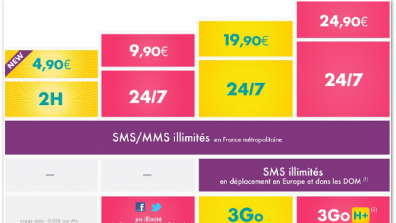 En revanche, le forfait 2h à 14,90€ ne sera plus commercialisé à partir du 24 avril. L’opérateur prévoit une option 1Go à 10€ (débit réduit au-delà). L’option sera dédiée au forfait à 4,90€ et permettra ainsi de reconstituer le forfait supprimé.
