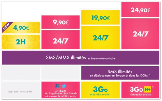 En revanche, le forfait 2h à 14,90€ ne sera plus commercialisé à partir du 24 avril. L’opérateur prévoit une option 1Go à 10€ (débit réduit au-delà). L’option sera dédiée au forfait à 4,90€ et permettra ainsi de reconstituer le forfait supprimé.