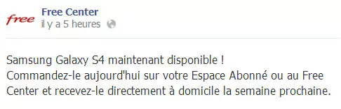 Nous vous annoncions cet après midi que Free Mobile proposait les Samsung Galaxy S4 dans sa boutique en ligne. L’opérateur a donnés quelques indications quant aux délais de livraison sur la page Facebook des Free Centers. Free indique que ceux commandés aujourd’hui seront reçus la semaine prochaine : « Commandez-le aujourd’hui sur votre Espace Abonné ou au Free Center et recevez-le directement à domicile la semaine prochaine ».