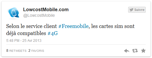 Les cartes SIM envoyées par Free Mobile seraint déjà prêtes pour la 4G d’après Lowcostmobile, relayant les informations du service client. Si l’information se confirme, Free ne serait pas le seul opérateur à anticiper le déploiement du réseau de quatrième génération. Sosh, l’opérateur low-cost du groupe Orange, envoie également des cartes SIM compatibles 4G à certains clients résidant dans les zones de couverture, laissant ainsi présager l’ouverture du réseau aux clients Sosh dans un avenir proche.