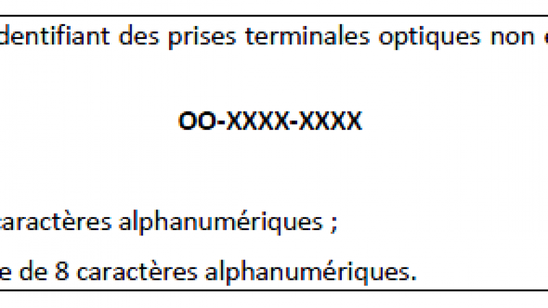 Cet identifiant unique à l’échelle nationale, doit être stable dans le temps et accessible par le client par les techniciens lors d’une intervention. L’ARCEP préconise ainsi un identifiant unique , respectant un format standardisé à 10 caractères, qui sera attribué pour chaque ligne FTTH par un gestionnaire d’identifiant, le plus souvent l’opérateur d’immeuble.