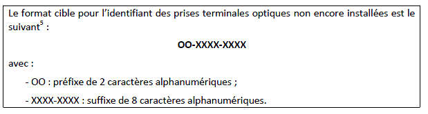 Cet identifiant unique à l’échelle nationale, doit être stable dans le temps et accessible par le client par les techniciens lors d’une intervention. L’ARCEP préconise ainsi un identifiant unique , respectant un format standardisé à 10 caractères, qui sera attribué pour chaque ligne FTTH par un gestionnaire d’identifiant, le plus souvent l’opérateur d’immeuble.