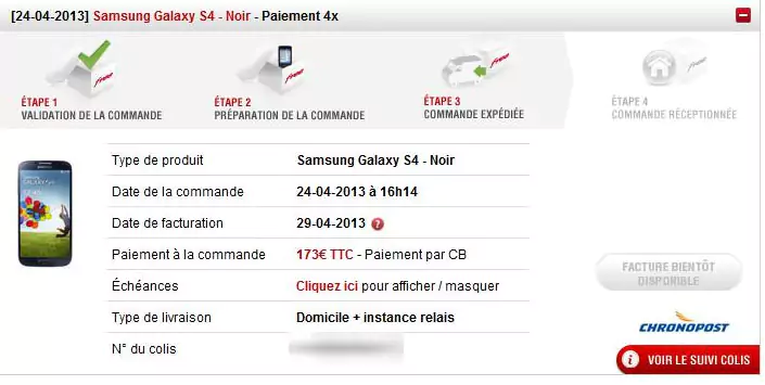 C’est donc aujourd’hui que les premiers Galaxy S4 ont été expédiés aux abonnés Free Mobile ayant effectué leur commande le jour de la sortie. Bruno, un abonné Free Mobile et lecteur d’Univers Freebox, nous a transmis la capture de son espace abonné Free Mobile, montrant l’expédition du téléphone.