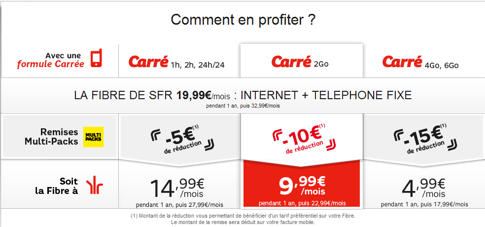 Dans cette offre, les clients multipack pourront bénéficier de remises sur les abonnements fibre optique. La fibre a partir de 19,99 € / mois tombe à 4,99/mois pour les clients 4Go/ 6/Go.