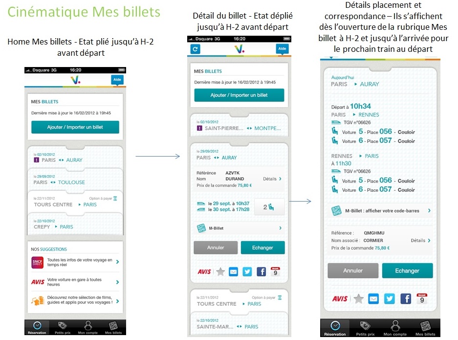 En plus, du ticket Online, l’application permet d’accéder à toutes les information sur le voyage, avec la possibilité de gérer ses réservations, d’échanger et annuler jusqu’au départ du train. A partir de H-2 avant le départ du train, toutes les informations du voyages sont disponibles : horaires, n° du TGV, placement dans le train et correspondances, références client….