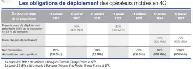 L’ARCEP étend faire du déploiement de la 4G un objectif prioritaire, et a élaborer en ce sens un dispositif adapté. En premier lieu, les autorisations d’utilisation de fréquences dans la bande 800 MHz délivrées le 17 janvier 2012 fixent des objectifs ambitieux de couverture du territoire, à la fois sur le plan national et départemental.