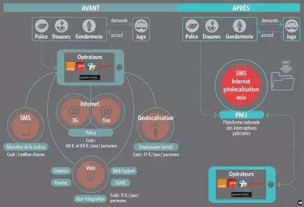 Annoncé en octobre 2012 pour un lancement prévu en 2013 , la France va se doter d’une Plateforme Nationale aux Interceptions Judiciaires (PNIJ). L’objectif : une plateforme centralisée pour toutes les demandes d’écoute des conversations téléphonique, SMS, géolocalisation, et de surveillance internet à moindre coût.