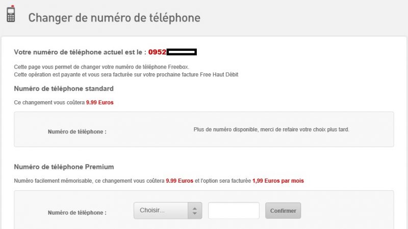 Free craint-il d’être prochainement de se retrouver à cours de numéros de téléphones fixes ? Il semble que ce soit bien le cas puisque depuis quelques jours, il n’est plus possible de changer son numéro depuis l’interface de gestion Freebox. Un message indique « Plus de numéro disponible, merci de faire votre choix plus tard ».