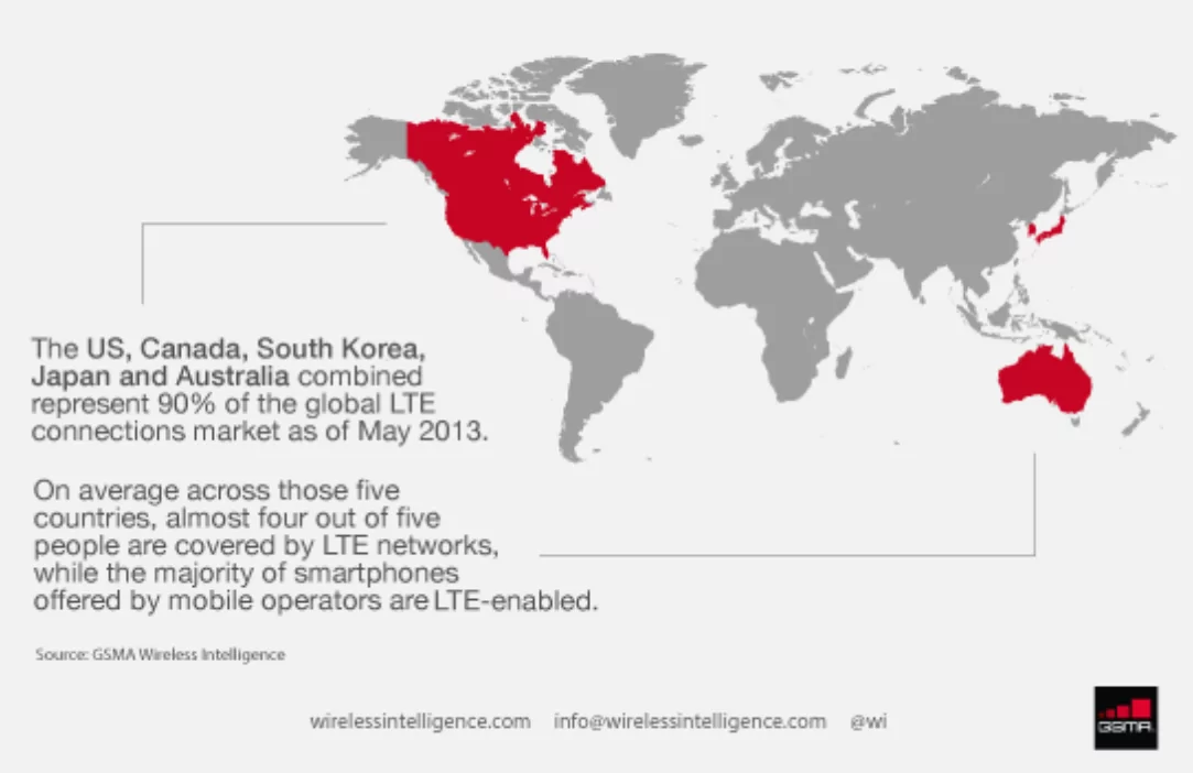 90 % d’entre eux se concentrent dans 5 pays : les Etats-Unis, le Canada, la Corée, le Japon et l’Australie. Dans ces 5 pays, la population couverte par les réseaux totalise les 80% de la couverture et la majorité des smartphones commercialisés disposent d’ une compatibilité 4G.
