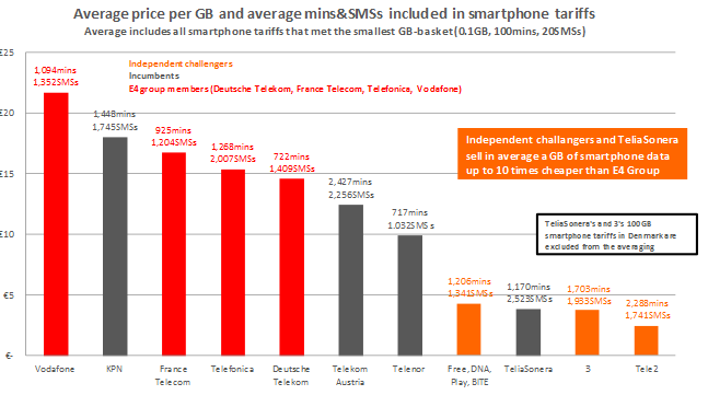 Enfin si l’on étend cette étude sur des forfaits jusqu’à 4Go de données consommés, les opérateurs indépendants dont Free fait parti sont constamment 2 à 3 fois moins chers que leurs homologues opérateurs historiques (France Télécom, Deutsche Telekom, Vodafone, Téléfonica).
