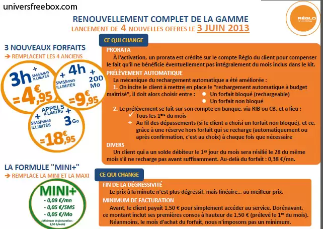 Forfait à la consommation : 1,50 euros (incluant les premières minutes de consommations). Le prix des consommations est en baisse par rapport au forfait précédent : 0,09€/mn, 0,05€/SMS et 0,05€ par Mo