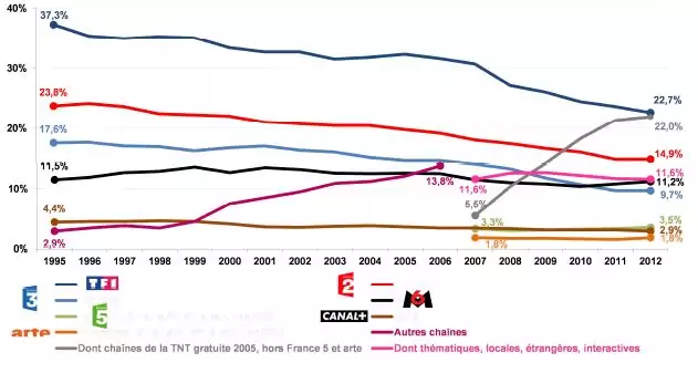 Hier le CSA publiait son rapport annuel 2012. Ainsi il nous présente l’évolution des parts d’audience des chaînes de télévision depuis 1995.