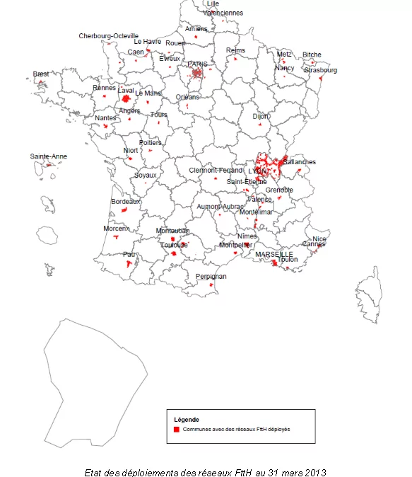 L’ARCEP recense ainsi, au 31 mars 2013, 8,9 millions de logements éligibles aux offres très haut débit supérieur ou égal à 30 Mbits dont 3,4 millions de logements situés en dehors des zones très denses. A cette date le nombre de logement en très haut débit en réseau FTTH était de 2,4 millions soit une augmentation de 52 %.