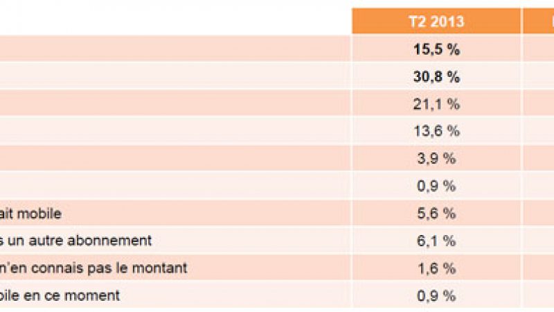Les auteurs de ce baromètre indiquent que l’effet Free Mobile se fait toujours sentir. En effet, que le montant que les personnes interrogées déclarent allouer à leur forfait mobile est en baisse : désormais, près d’une personne sur deux dispose d’un abonnement à moins de 20 euros. Le nombre de personnes déclarant payer leur forfait entre 11 et 20 euros est celui qui progresse le plus ce trimestre (+ 18,5 %). La part des individus qui déclarent payer moins de 10 euros est en augmentation pour le deuxième trimestre consécutif, cette hausse étant portée par les 15-34 ans (+ 59,5 %) et les CSP- (+ 29,6 %). Toutefois, ce sont les 50 ans et plus qui restent les plus nombreux à privilégier ces forfaits à très bas coût. On observe moins d’offres à plus de 20 euros, signe d’une volonté de consacrer un budget plus faible au forfait mobile, alors même que les usages s’accentuent.