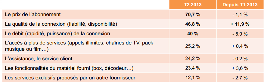 A ce titre, l’étude s’intéresse chaque trimestre aux raisons qui pousseraient les abonnés à changer de FAI. Toujours à l’esprit des consommateurs c’est le prix qui s’avère être le motif prédominant dans le changement de Fournisseurs d’Accès à Internet en légère baisse par rapport au 1er trimestre. En forte progression (+11.9%) et avec 46,8% de réponses, c’est la qualité de la connexion (fiabilité et disponibilité) qui préoccupe les abonnés devant le débit (rapidité et puissance) de la connexion (40%). En cause, les problèmes d’interconnexion avec Youtube que rencontrent certains FAI.