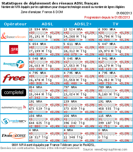 Au 30 mai, Free comptabilise au 31 mai 4795 NRA dégroupés 26 478 000 lignes dégroupables.