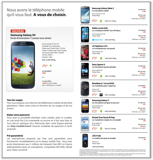 Interrogé, Free nous indique que chaque brochure met en avant un nouveau mobile en fonction de son actualité, en partenariat avec le constructeur : lancement de nouveau produit, accessoire offert (comme dernièrement le chargeur USB portable Nokia DC-16 offert pour tout achat d’un Nokia Lumia 620), les offres de remboursement (dont nous vous faisions l’écho récemment), etc. Actuellement, c’est le Samsung Galaxy S4 qui est à l’affiche.