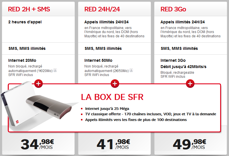 Les trois offres incluent La Box de SFR : Internet jusqu’à 25 Méga, la TV de SFR (170 chaînes dans le bouquet basique) et les appels illimités vers les fixes de plus de 100 destinations. Les offres sont soumises à conditions et ne sont pas disponibles pour les clients SFR encore engagés qui souhaiteraient changer d’offre pour une offre RED.