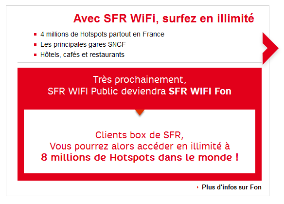 SFR annonce que son réseau communautaire actuellement appelé SFR Wifi Public devient SFR Wifi Fon. Outre le changement de nom, c’est une migration vers les hotspots "fon" de la totalité du parc SFR Wifi. SFR est déjà partenaire depuis longtemps avec le leader mondial des réseaux communautaires "Fon" qui représente 5,5 millions de hotspots dans le monde.