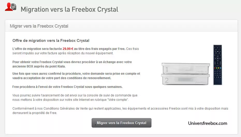 La migration de la Freebox HD à la Freebox Crystal est facturée de la même façon que le passage de la Freebox HD à la Freebox Révolution soit 119,99€ – 30€ par année d"ancienneté. Ces frais seront imputés sur votre facture après réception du nouvel équipement. Pour obtenir votre Freebox Crystal vous devrez procéder à un échange avec votre ancienne BOX auprès du point Kiala. Une fois que vous aurez confirmé la procédure, votre demande sera prise en compte et vaudra acceptation de votre part des conditions de renouvellement. Free procédera ensuite à l’envoi de votre Freebox Crystal sous quelques semaines.