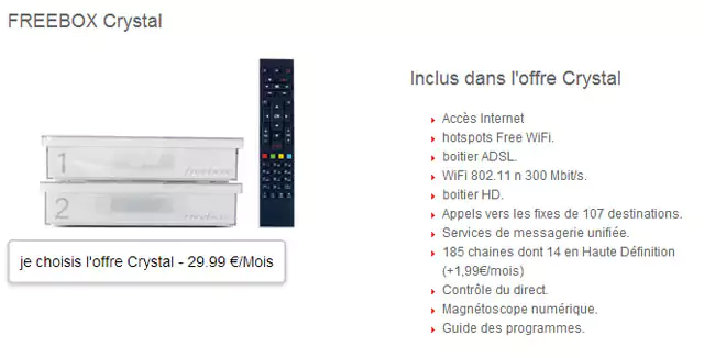 Aussitôt annoncée, aussi disponible pour les nouveaux abonnés. En effet, lors de la procédure d’inscription sur le site de Free, il est maintenant proposé soit la Freebox Révolution, soit la Freebox Crystal. Tous les abonnés qui s’inscriront à partir d’aujourd’hui à l’offre à 29,99€ (+1,99€ pour l’option TV) bénéficieront donc de la toute dernière version de Freebox V5.