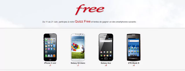 Nous vous l’annoncions hier, Free propose un jeu-concours sous la forme d’un quizz jusqu’au 21 juin prochain à l’ensemble de ses fans sur Facebook. A la clé, 10 smartphones dont l’iPhone 5 et le Samsung Galaxy S4 pour les participants qui auront la chance d’être tirés au sort parmi les bonnes réponses.