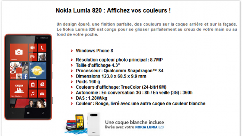 Le Lumia 820 bénéficie de nombreux avantages dont le chargement sans fil avec une coque optionnelle. Il dispose notamment d’un écran 4,3 pouces (affichage : AMOLED) et d’un appareil photo de 8,7 Mégapixels. Le processeur est un Qualcomm Snapdragon S4 (Double cœur 1,5 GHz). C’est le 3ème téléphone 4G présent dans la boutique Free Mobile (après le Samsung Galaxy S4 et le Sony Xperia SP).