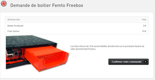 Free vient de rendre disponible la commande des femto Freebox sur l’interface abonné. Il suffit de se rendre dans la rubrique « Freebox » puis « commander un boitier femto Freebox ». Le boitier sera envoyé à votre domicile, par Chronopost. En cas d’absence lors de la livraison, le colis sera déposé dans un point relais proche de chez vous. Des frais d’envoi de 10 € seront facturés