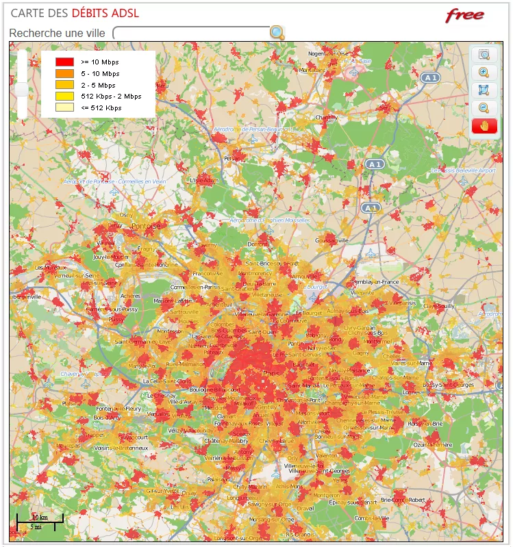 Free vient tout juste de nous informer d’une petite nouveauté sur son site Internet. Depuis quelques instants, l’opérateur propose une nouvelle carte montrant l’évolution des débits ADSL et représentant la disponibilité des services fixes à haut débit. Vous pouvez ainsi consulter, très simplement et en quelques clics, le débit auquel vous pouvez prétendre. Celui-ci varie entre 512 Kbps et plus de 10 Mbps (selon la zone géographique) :