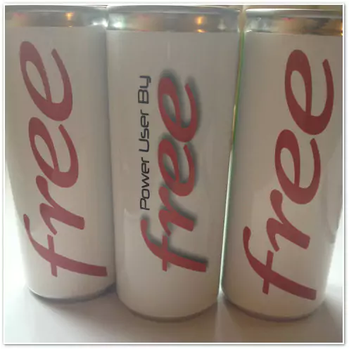 Clin d’oeil : C’est le week-end, nous en profitons donc pour vous proposer quelques clins d’oeil aux couleurs de Free. Après la télécommande Freebox Révolution en chocolat, la communauté des Freenautes était assoiffée. L’opérateur nous a donc gentiment proposé un jus de Free, un peu spécial. Une boisson NRJ-sante énergisante, « Power User by Free ». Les canettes ont été fabriquées par Clarcom Production. La sérigraphie a, quant à elle, été réalisée par Canpub.