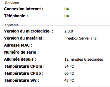 Courbes de température : cet outil permet de suivre les variations de température de la box server. Pour un abonné lambda cela n’apporte pas grand chose mais l’assistance pourra se servir de ces informations pour éventuellement déceler un dysfonctionnement matériel (surchauffe). Comme précédemment les données sont visibles pendant un mois.