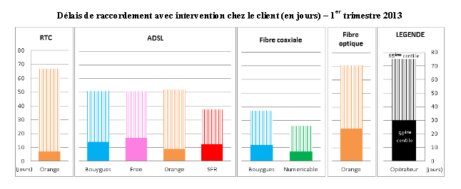 En cas d’intervention d’un technicien pour raccorder la ligne, seul SFR descend sous la barre des 40 jours, quand les trois autres opérateurs ADSL, dont Free, mettent environ 50 jours à raccorder 95% de leurs abonnés.