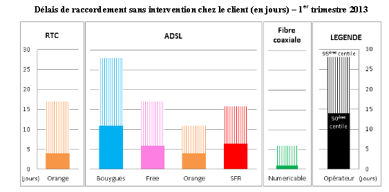 En cas d’intervention d’un technicien pour raccorder la ligne, seul SFR descend sous la barre des 40 jours, quand les trois autres opérateurs ADSL, dont Free, mettent environ 50 jours à raccorder 95% de leurs abonnés.