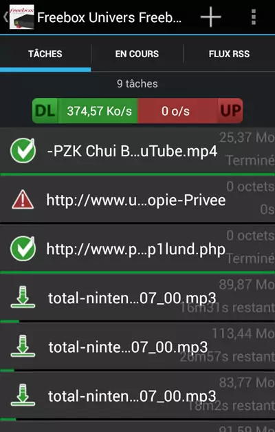 Tâches : permet de visualiser tous les téléchargements effectués, qu’ils soient terminé, en cours, en attente ou annulés.