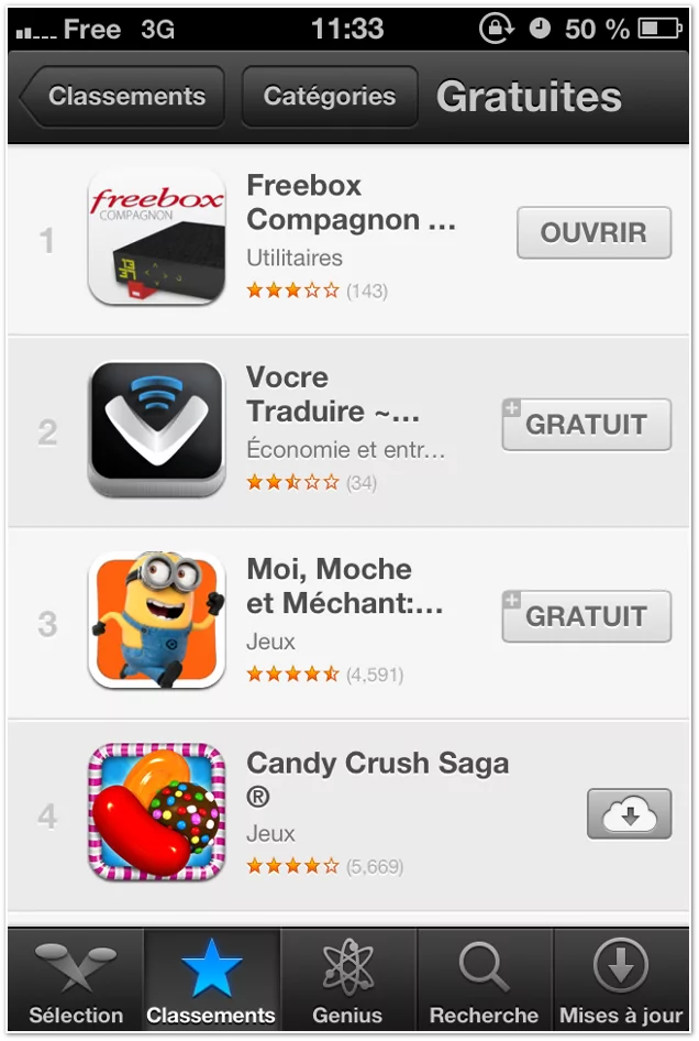 Quel succès ! Depuis hier, Free offre à ses abonnés, « Freebox Compagnon », une toute nouvelle application permettant d’emmener sa Freebox partout dans le monde. Aujourd’hui, l’application trône à la première place du classement de l’Appstore (dans la rubrique : Gratuite). Une première place et un premier constat prometteur pour toutes les équipes Free. Pour découvrir Freebox Compagnon et Freebox OS, la 2e révolution de la Freebox, nous vous proposons un dossier complet, disponible à cette adresse. Freebox Compagnon est disponible gratuitement sur l’Appstore (iOS) et sur Google Play (android).