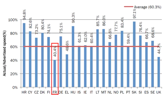 La France se situe en dernière position avec à peine 40 % des débits annoncés par les opérateurs. L’étude précise néanmoins que certains abonnements vendues en France "ne seront pas vendues à des clients qui ne pourront de toute manière pas en profiter."