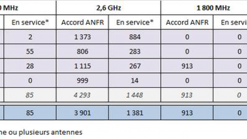 L’ANFR (Agence Nationale des Fréquences) a publié son observatoire 2G, 3G et 4G. Au 1er juillet 2013, l’ANFR a autorisé 3 901 sites 4G dans la bande 2,6 GHz, en hausse de plus de 20 % sur un mois. 1 381 sont déclarés en service. En outre, 385 sites ont reçu un accord de l’Agence pour la 4G en bande 800 MHz et 913 pour la 4G en bande 1 800 MHz.