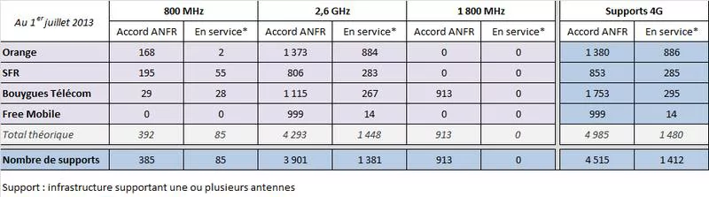 L’ANFR (Agence Nationale des Fréquences) a publié son observatoire 2G, 3G et 4G. Au 1er juillet 2013, l’ANFR a autorisé 3 901 sites 4G dans la bande 2,6 GHz, en hausse de plus de 20 % sur un mois. 1 381 sont déclarés en service. En outre, 385 sites ont reçu un accord de l’Agence pour la 4G en bande 800 MHz et 913 pour la 4G en bande 1 800 MHz.