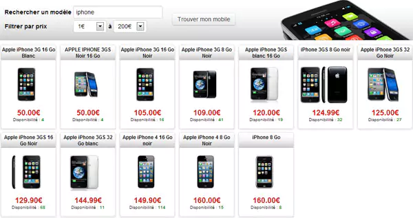 Cette boutique Univers Freebox vous permet une recherche très fine par type ou marque de mobile, mais vous propose également de sélectionner une fourchette de prix, de 10 à 20€ par exemple. Dans l’exemple ci-dessous, la recherche a été faite sur des iPhone à moins de 200€.