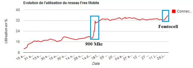 Si l’ARCEP a déjà annoncé que les femtocells ne seraient pas prises en compte dans le calcul de la couverture réseau, elles n’en n’auront pas moins un impact sur cette dernière. Les premières livraisons de femto Freebox ont été réceptionnées par les abonnés le 26 juin, et leurs effets sont déjà visibles. En effet, grâce à l’application Free Mobile Netstat, il est possible d’estimer le taux d’utilisation du réseau propre de Free Mobile par rapport à l’itinérance Orange. Et depuis l’arrivée des femtocells, l’augmentation du taux d’utilisation du réseau Free Mobile est en nette augmentation, passant de 32,3% à 35,7% en à peine une semaine, alors qu’il etait relativement stable ces derniers mois. L’effet est encore plus visible en regardant la courbe de l’évolution publiée par freemobile.toosurtoo. De la même façon, sur cette même courbe, on peut également constater l’augmentation du taux de couverture Free Mobile en début d’année liée à l’utilisation des fréquences 900 MHz.