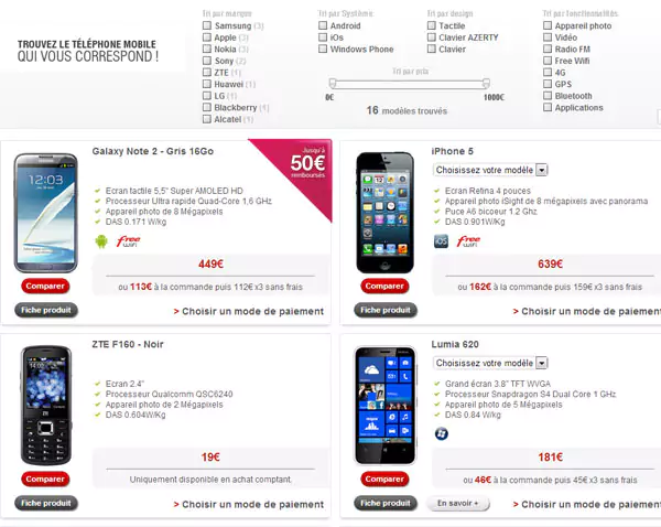 Par ailleurs, tous les modèles d’un même téléphone sont regroupés sur une seule fiche. Pour un iPhone 5, il sera ainsi proposé la version noir ou blanche ainsi que les différentes capacités de stockage, sur la même fiche. Cette dernière présente également les caractéristiques principales du téléphone. Le bouton « choisir un mode de paiement » affiche le cout et les mensualités du téléphone.