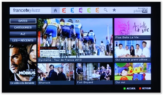Pour parcourir la nouvelle interface Pluzz : à l’aide de votre télécommande, rendez-vous sur la page d’accueil de Freebox TV (Touche Free), puis dans le menu « Vidéos ». Choisissez ensuite le service « Freebox Replay ». Enfin, sélectionnez une des chaînes de France Télévision.
